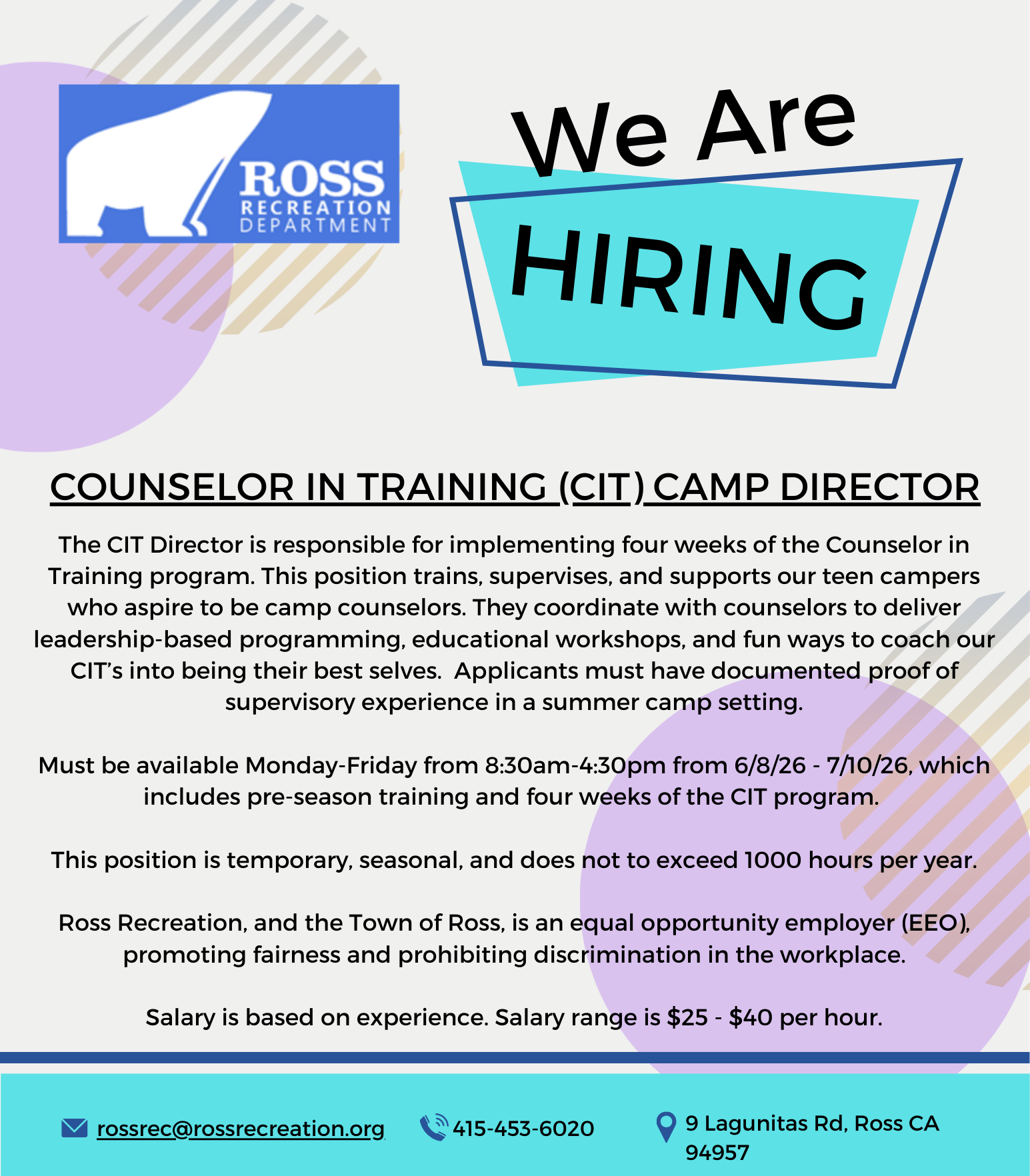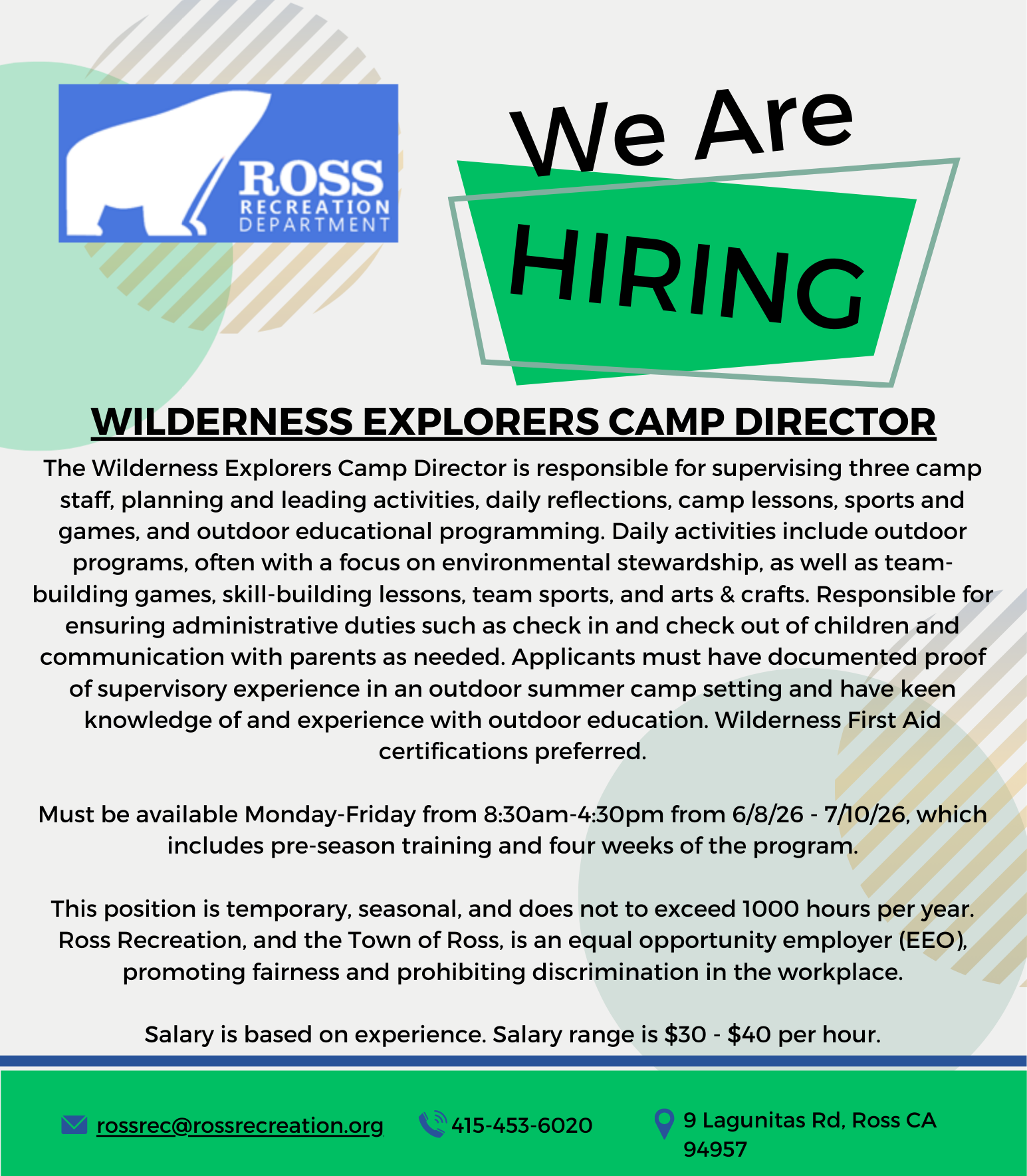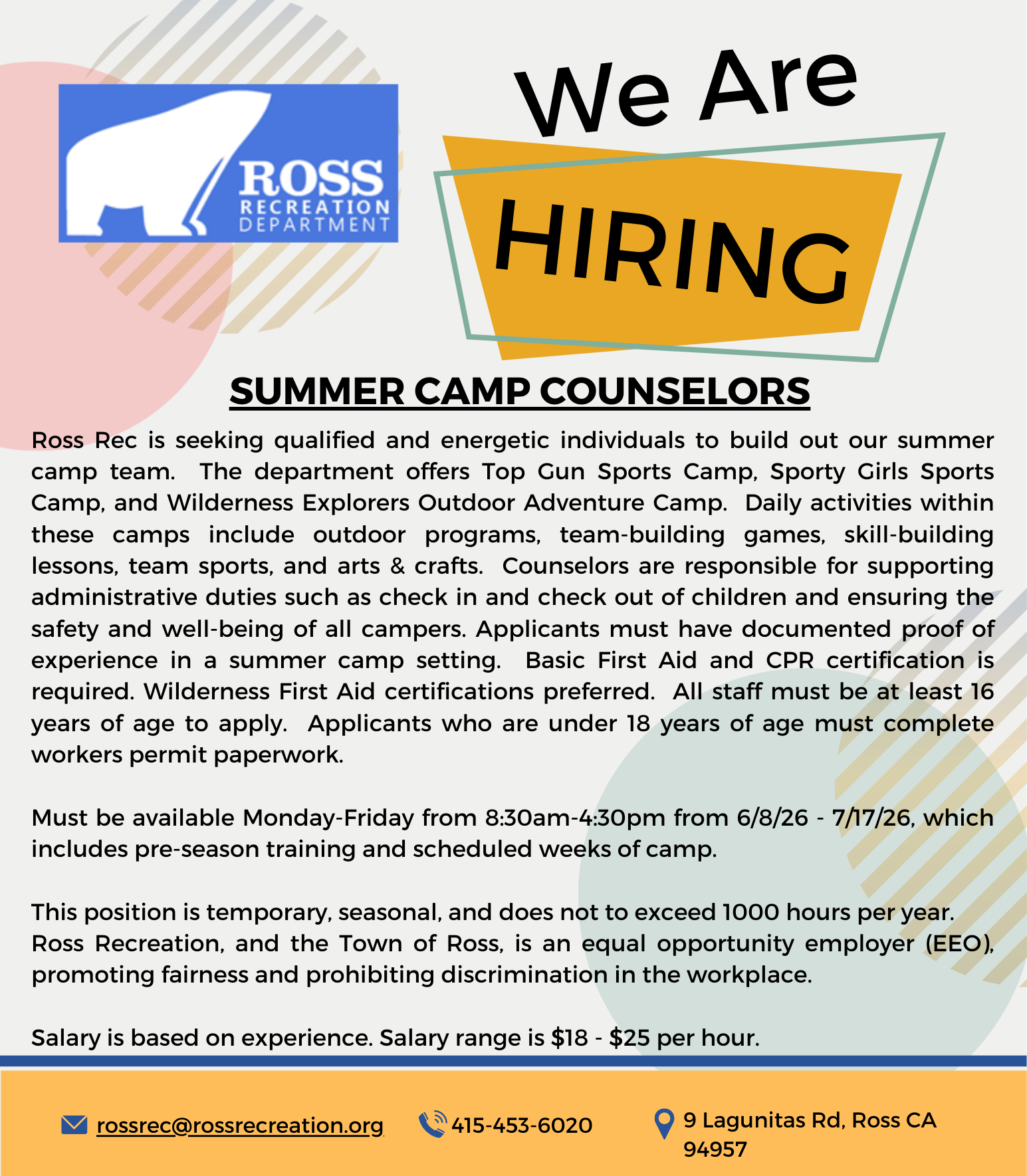 Ross Recreation, established in 1972 as a Department of the Town of Ross, is dedicated to offering a diverse range of recreational programs and community services to the residents of Ross and surrounding areas. Over the years, our department has evolved significantly, expanding from a limited number of classes to now offering a wide array of over 100 classes annually catering to all age groups, from infants to seniors. We take pride in fostering a welcoming and inclusive environment that promotes recreational enrichment and strengthens community bonds. Welcome to our community!
